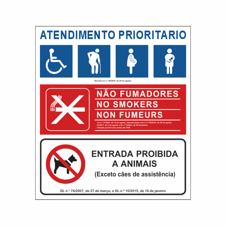 Este sinal destaca Proibido Fumar, Atendimento Prioritário e Entrada Proibida a Animais de forma clara e organizada. Portanto, os clientes identificam rapidamente cada aviso, enquanto os colaboradores aplicam corretamente as regras. A impressão é nítida e resistente à luz solar, humidade e limpeza, garantindo durabilidade prolongada.